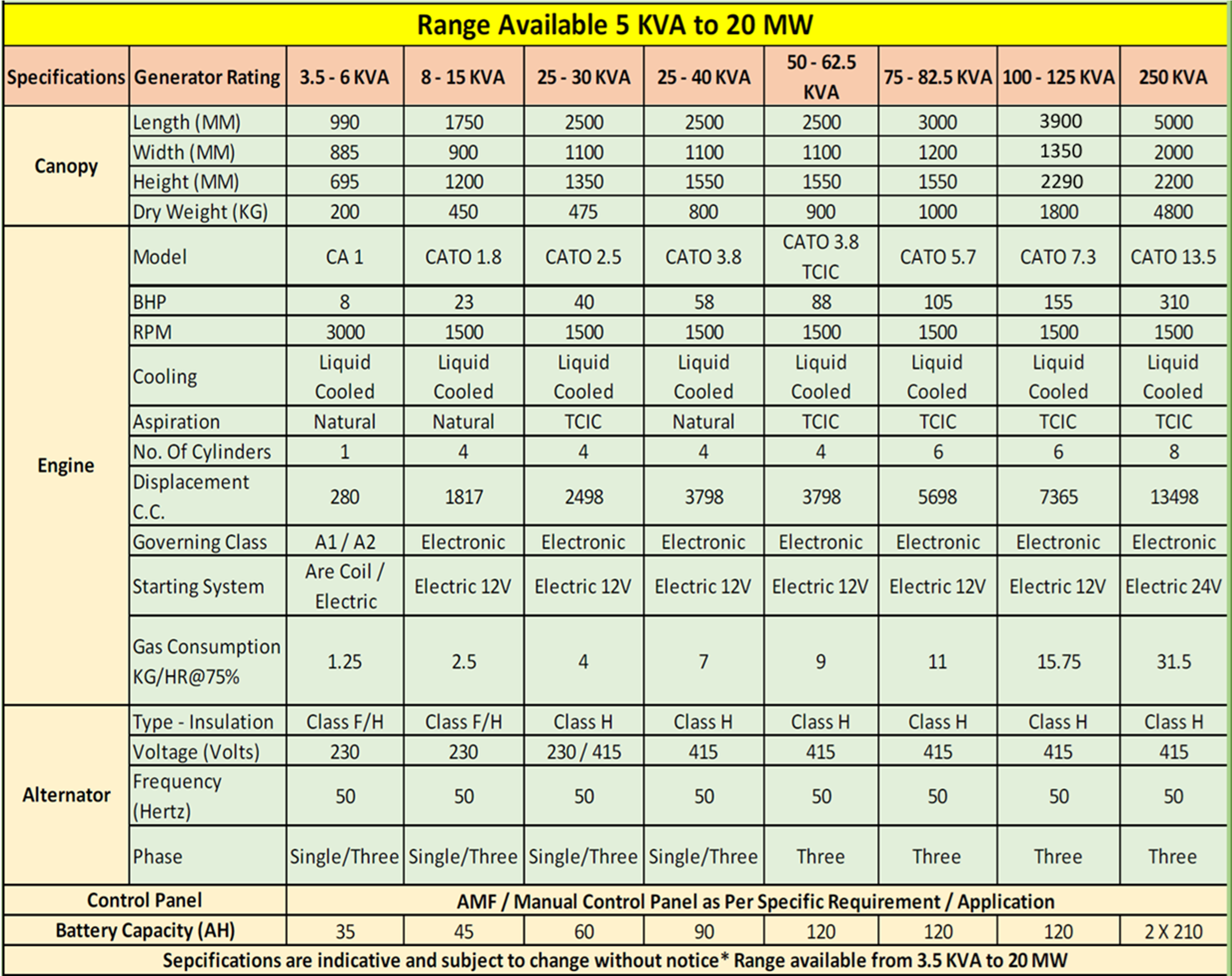 Chroma-Ator Gas Engines & Generators Specification From 3.5 KVA To 250 KVA